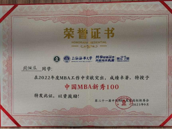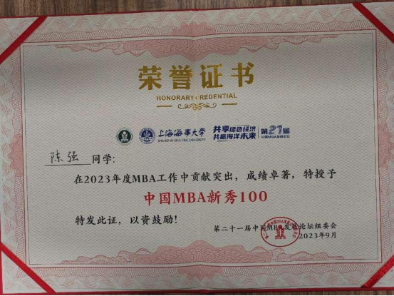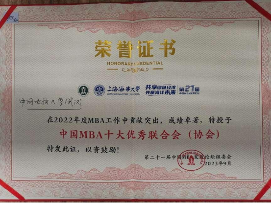 公司专硕联合会喜获“2022年度中国MBA十大优秀联合会”荣誉称号,MBA2018级员工栾相辉获评“中国MBA员工创新创业新星”称号;MBA2021级、地大MBA帆船协会会长周佩佳获评“2022年度中国MBA新秀100”称号;MBA2023级班长陈强获评“2023年度中国MBA新秀100”称号。