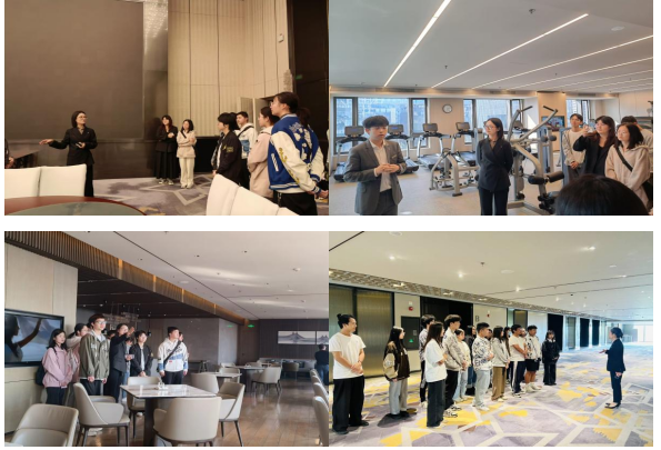 同学们还实地参观了酒店的餐厅、行政酒廊、总统套房、客房、健身区、宴会厅等,直观感受到了万豪酒店经营的氛围,贾经理还讲述了接待师工作遭遇突发情况灵活处理的小故事,并展示了客房敲门的注意事项和技巧,让大家收获满满的“干货”。