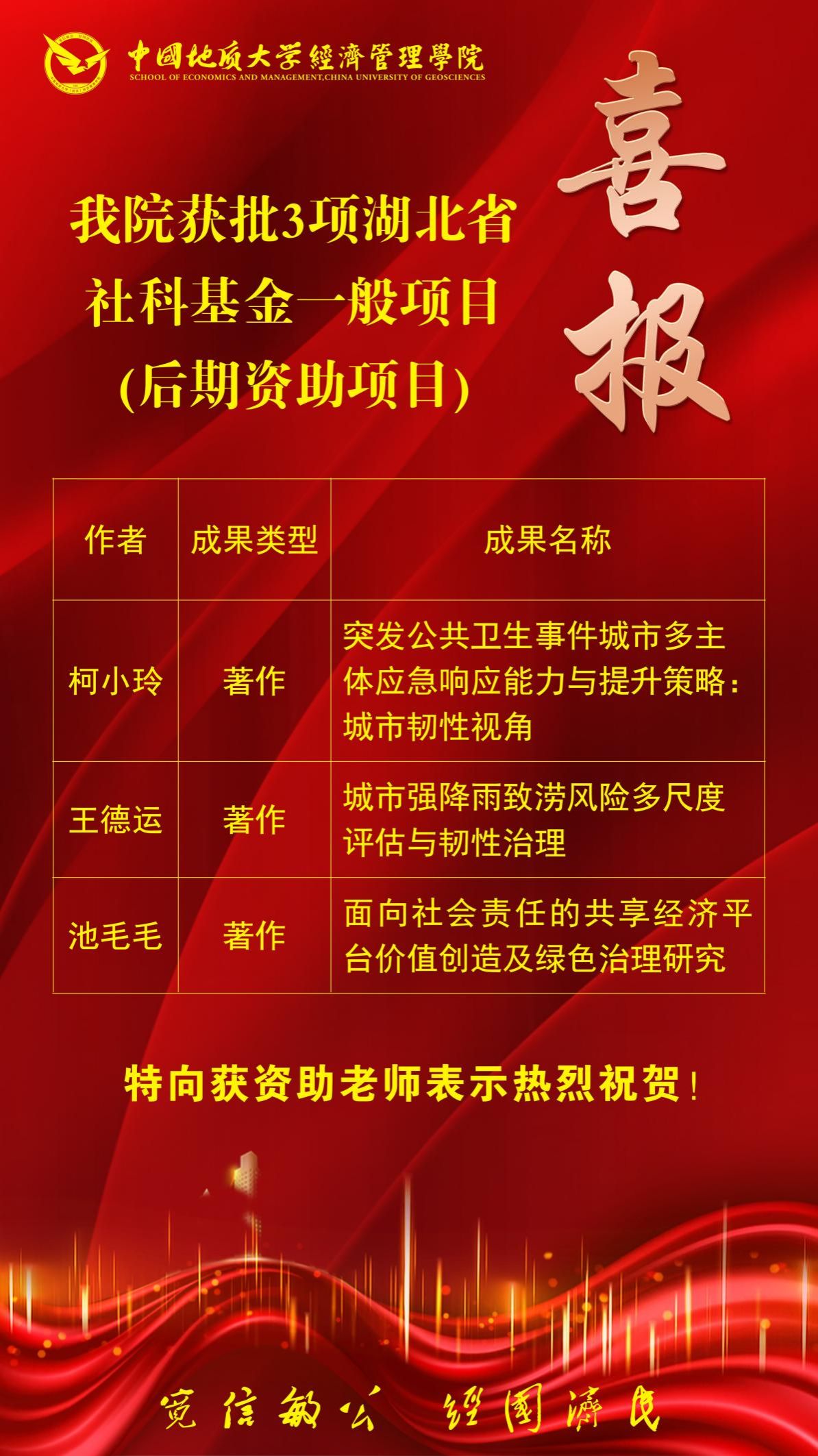 (通讯员 胡松琴)11月14日,2023年度湖北省社科基金一般项目(后期资助项目)拟立项名单公布,英国365上市公司柯小玲、王德运、池毛毛三位老师申报的课题项目成功立项,公司科研成果再次喜获丰收。
