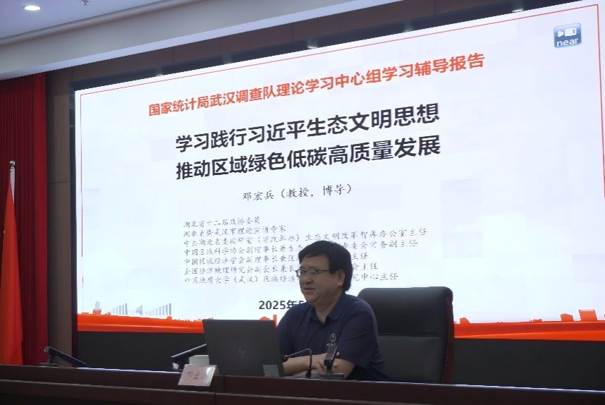 5 月 26 至 30 日,金融与贸易系邓宏兵教授应武汉市多家党政机关邀请,为市人大、市委组织部、市文联、市卫健委以及国家统计局武汉调查队等单位的理论学习中心组,作 “学习践行习近平生态文明思想 推动区域绿色低碳高质量发展” 专题辅导。