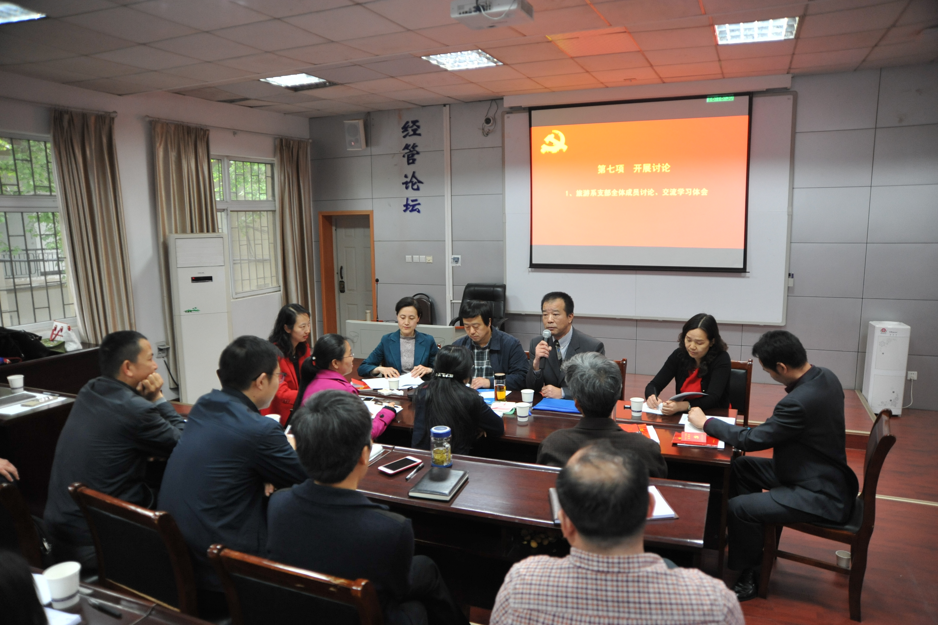 在班主任工作培训暨“支部主题党日”示范观摩活动中,与会人员观摩了由旅游系党支部示范性开展的“支部主题党日”学习活动。示范学习活动依照程序依次进行参会人数清点、齐唱国歌、重温入党誓词、缴纳党费、学习《中国共产党章程》(第五章 党的基层组织)等“规定动作”,然后进入以“班主任工作”为主题的经验分享与交流这一“自选动作”。会上,受旅游系支部邀请,校院两级优秀班主任代表李江敏、王萍、李金滟等三位老师先后以图文并茂的PPT介绍了她们在思想政治教育、专业学习指导、班团组织建设、班级凝聚力与班风建设、员工快乐成长与幸福学习生活等方面的先进事例和优秀经验。基于此,旅游系党员教师和到会的班主任老师结合各自的班主任工作经历,就老员工的思想引导、专业知识引领、学习方式转变、创新创业指导等方方面面,从教师个人应具有的理想与信念、专业知识、责任心、爱心、耐心、细心等展开了交流和探讨。公司副经理(主持工作)杨树旺教授发言指出,教育以立德树人为本,辅导员与班主任队伍是高校思想政治教育工作的基石,勉励全院教师遵循思想政治工作规律、教书育人规律和员工成长规律,回归本心、不忘初心,全院育人、全员育人。