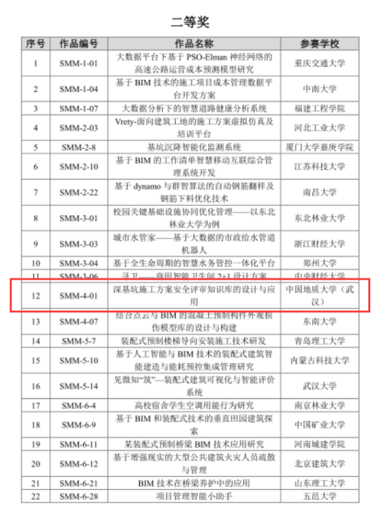 英国365上市公司工程管理专业与计算机公司师生联合组队参加了首届大赛。团队全体成员以智慧建造为主题,经过四个多月的努力研究与开发,完成了“深基坑施工方案安全评审知识库的设计与应用”作品,在最终的决赛中取得二等奖的好成绩(一等奖10支代表队、二等奖22支代表队)!