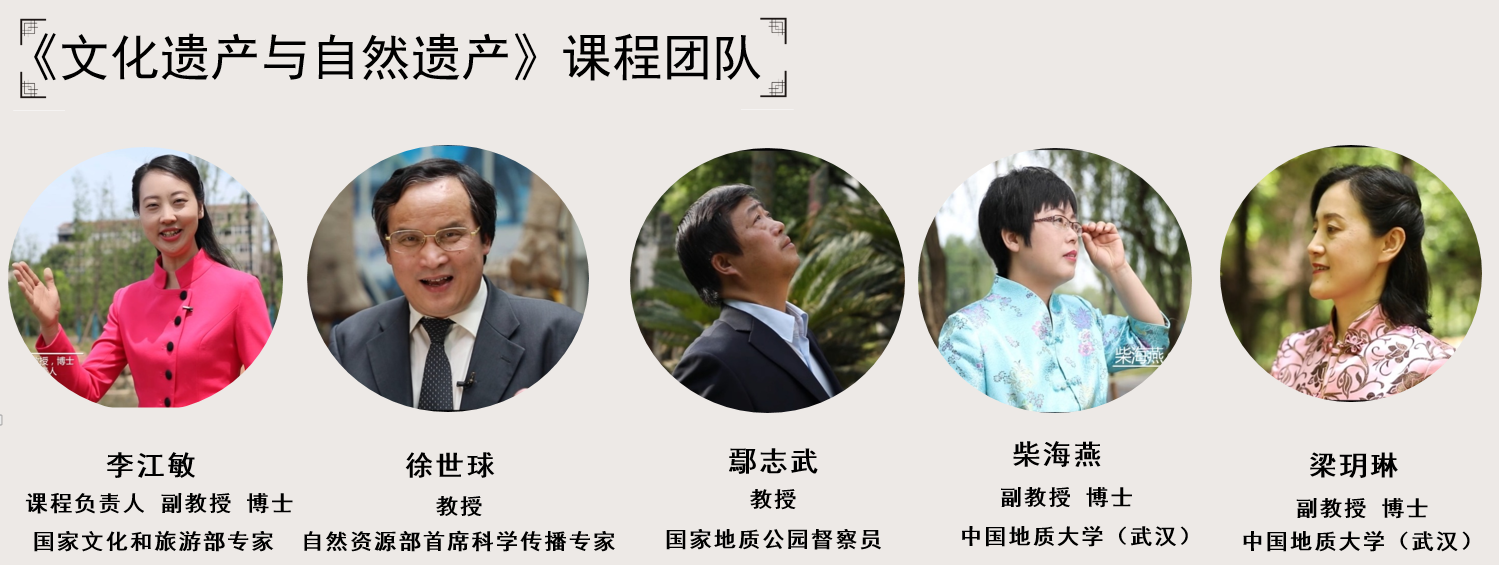 李江敏老师团队(徐世球、鄢志武、柴海燕、梁玥琳)的《文化遗产与自然遗产》课程这次入选国家级线上一流课程。该课程面向对旅游感兴趣的在校员工和社会大众,以文化遗产与自然遗产的源起与发展为导入,通过丰富多样、生动有趣、深入浅出的讲述,带领员工赏析古代建筑、古典园林、古城民居、帝王陵寝,道教圣地、奇山丽水、神秘化石等众多精华旅游资源,让员工对传统文化学会鉴赏并由衷热爱,对自然资源探索成因并科学审美,拥有品读文化与自然遗产的鉴赏力,并树立科学的世界遗产保护观。《文化遗产与自然遗产》课程先后获得湖北省精品视频公开课、全国首届“最美慕课”一等奖、湖北省首批精品在线本科课程。