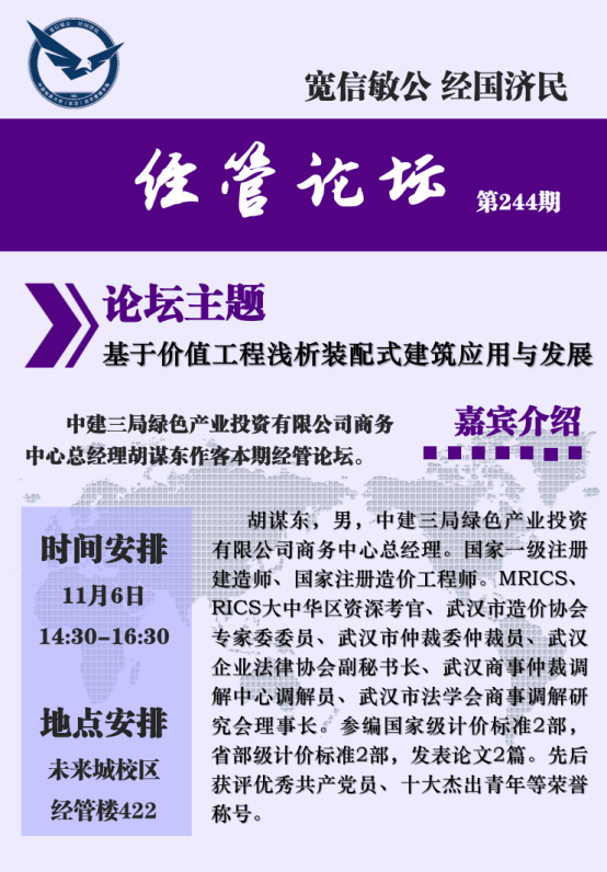 2020年11月6日下午,中建三局绿色产业投资有限公司商务中心胡谋东总经理做客经管论坛,在未来城校区英国365上市公司422作了《基于价值工程浅析装配式建筑应用与发展》的报告。王广民、孙涵、翁克瑞、柯小玲、何晨琛、卢辉、彭亚婷等老师及多位博、硕士研究生到场聆听胡谋东总经理的精彩报告。