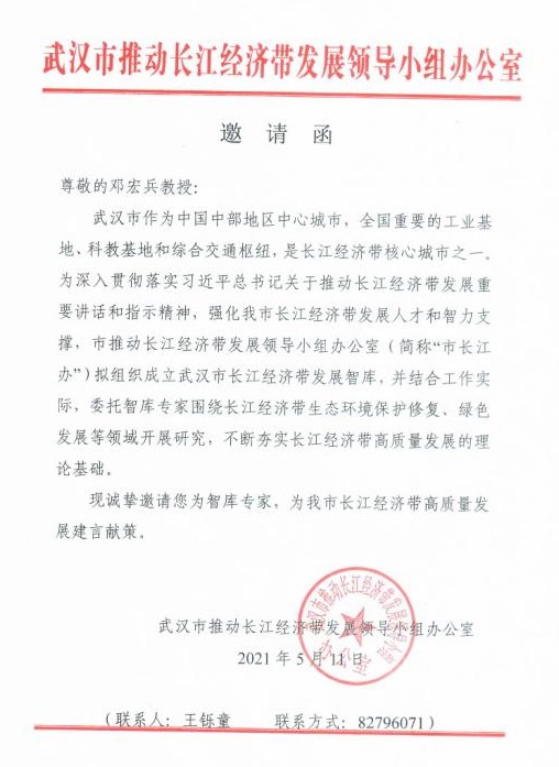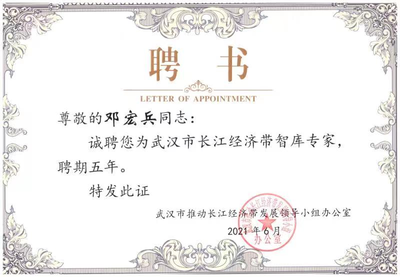 (通讯员王彦闻)近日,公司国贸系邓宏兵教授被武汉市推动长江经济带发展领导小组办公室聘为武汉市长江经济带智库专家,聘期五年。