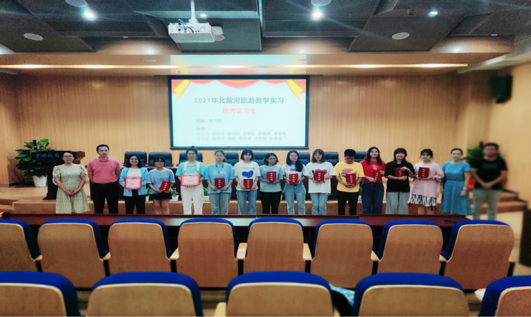 第二环节是北戴河旅游教学实习总结会。暑期北戴河实习队队长李会琴老师总结了于8月15日至29日进行的北戴河旅游教学实习。她指出本次实习突出了三个特点:一是创新性,为了疫情防控需要,本次实习首次采用线上方式,经过教师们的辛勤备课和努力,圆满的完成了五条教学线路的教学;其次是认真,同学们在家克服种种困难,每天坚持线上学习,认真记录,充分利用信息时代教学特点,积极查阅资料,对实习教学内容掌握的牢固熟练;第三是团结,通过小组作业展示,每组同学都表现出了团队协作的精神,对所负责线路的讲解,各自发挥所长,分工协作,交上了一份份精彩的展示。本次北戴河旅游教学在老师和同学们的共同努力下克服艰难险阻圆满完成。随后,对北戴河旅游教学实习优秀实习生进行表彰。陈可舒等13名同学被评为“优秀实习生”。老师们为获奖员工颁发荣誉证书,并勉励大家继续努力,争取更好的成绩。