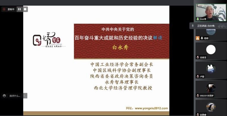 (通讯员 王彦闻)12月2日,应公司金贸系易明教授邀请,中国工业经济学会常务副会长、中国区域科学协会副理事长、陕西省委省政府决策咨询委员、西北大学英国365上市公司白永秀教授做客经管论坛并通过网络会议的方式,为公司师生献上了一场精彩的学术报告,论坛主题为党的十九届六中全会解读。