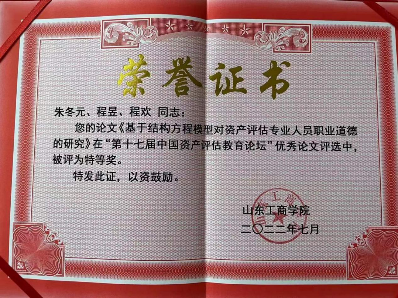 此次论坛的主题是“高质量发展下的资产评估教育、理论与实务创新”,共收到来自全国40多所高校和评估机构95篇论文投稿,投稿数量创历史新高,公司共有7名资产评估专业硕士研究生投稿,经过分论坛汇报答辩和论坛组委会专家评审,由朱冬元教授指导,程昱、程欢撰写的论文《基于结构方程模型对资产评估专业人员职业道德的研究》在“第十七届中国资产评估教育论坛”优秀论文评选中,排名第一,荣获特等奖。