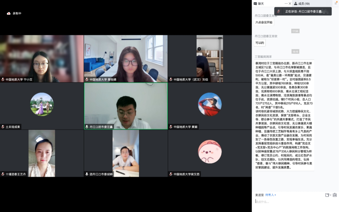 随后,公司经管公司团委副书记努尔夏提·居勒提简要介绍了公司“青力缔造”青年实践队的领队、指导老师及本硕博成员组成情况,以及团队前期工作基础。他介绍,近年来公司高度重视与十堰当地工作交流,自2018年以来在竹山县开展关于“绿松石+电商+非遗文化”等项目实践,公司师生及当地骨干员工多次发动群众共谋、共建、共管、共创、共享,多次获评“三下乡”社会实践、挑战杯、互联网+等系列活动及赛事省级奖项和荣誉。本次“青力缔造”实践队将不辱使命,继续充分发挥专业、人才、科研优势,以本硕博多学科交叉融合的团队优势,积极融入党政工作经验和地大工作实践理念,结合当地需求,为十堰丹江口贡献地大智慧和力量,争取带动群众解决实际困难,带来一定实质效益。