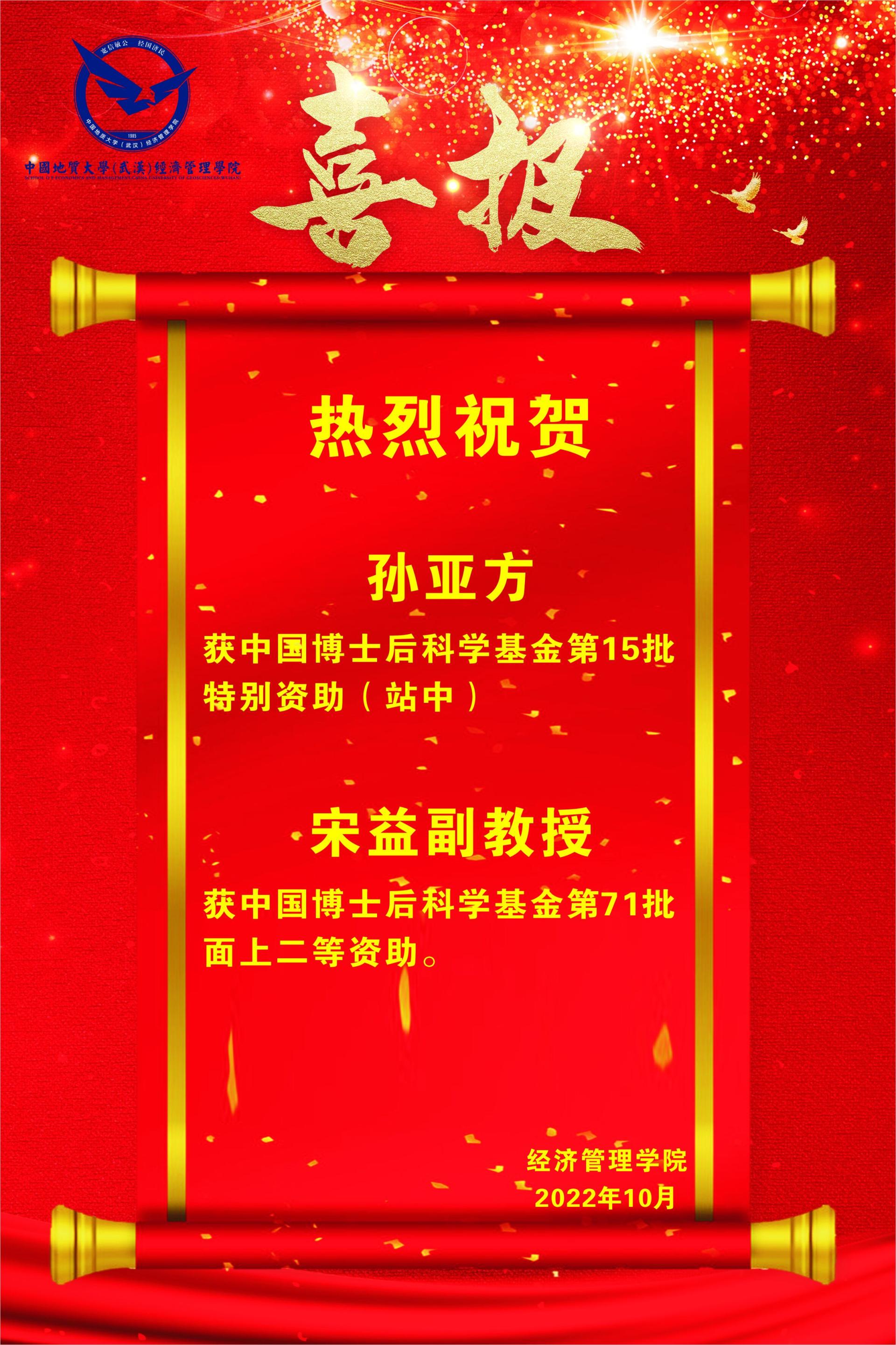 近日,中国博士后科学基金会公示了2022年度中国博士后科学基金特别资助名单和中国博士后科学基金第71批面上项目资助名单。公司获批2项资助,其中孙亚方获得第15批中国博士后科学基金特别资助(站中),宋益副教授获得中国博士后科学基金第71批面上二等资助。