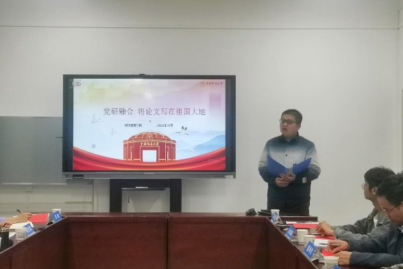 与会领导就如何学深悟透党的二十大精神,扎实推进研究生党建工作给予指导。王甫表示,设立导师团队研究生党支部,增进了教师与员工在科研和党建方面的双向联系,实现了研究生党员培养和导师党员素质的双提高。广大研究生党员要认真学原文悟原理,牢记重要论述,对比新旧表述,深度解读报告,紧密结合实际,在学习科研中学深悟透党的二十大精神,在学习党的二十大精神中找准研究方向,为全面建设社会主义现代化国家而不懈奋斗。何建新围绕“公司党建谋篇布局、示范引领,特色发展”三个问题,认为党和国家始终坚持全面从严治党,坚持把基层党组织建设成能够实现党的有效领导的坚强堡垒,并提出通过结合平台、培育样板、实现成效等方式,全面规划公司基层党建布局,并结合公司特点,以党建科研双融双促,打造党建品牌项目。