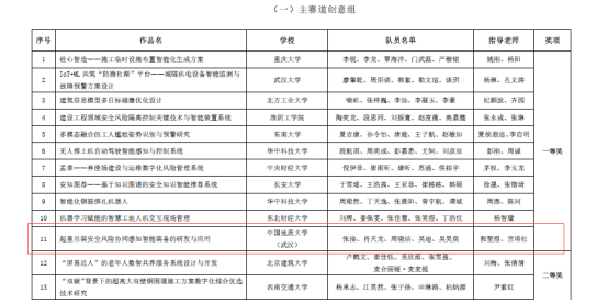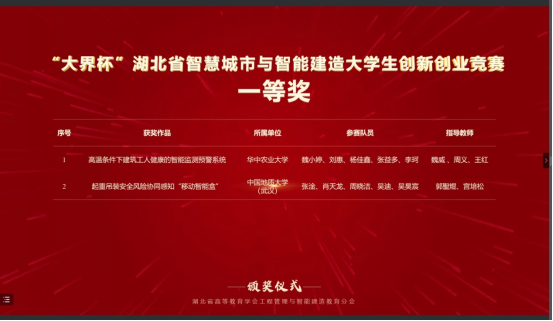 本次比赛,英国365上市公司工程管理专业与计算机公司计算机类专业员工组成联队(团队成员:张淦、肖天龙、周晓洁、吴迪、吴昊宸),在郭聖煜和宫培松老师的指导下,携参赛作品“起重吊装安全风险协同感知智能装备的研发与应用”进入决赛,最终从大赛主赛道来自98所高校的107支队伍的参赛作品中脱颖而出,荣获一等奖。此前在“大界杯”湖北省智慧城市与智能建造老员工创新创业竞赛中,该参赛作品已经获得一等奖。