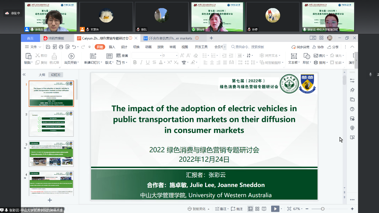 12月24日上午,以“绿色消费与绿色营销”为主题的报告中,各位专家带来了丰富的学术盛宴。江苏大学管理公司杜建国教授做了题为《供需协同视角下绿色消费行为促进机制》的分享,为大家打开了绿色消费行为研究的新视角。对外经济贸易大学国际商公司孙瑾教授做了题为《营销视角下可持续性消费相关研究“碳”索》的报告,从营销视角下分析可持续消费的背景、进展和未来发展方向。华中科技大学管理公司常亚平教授做了题为《谈谈“双碳”的商业机会》的报告,从营销视角分享实现“双碳”目标的商业机会和研究可能。日本关西大学商公司李振教授和做了题为《A review of social roles in green consumer behavior》的报告,分享了社会角色在消费者绿色消费行为的作用的文献综述。