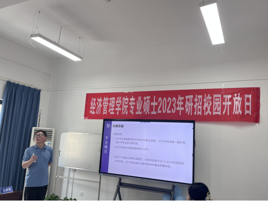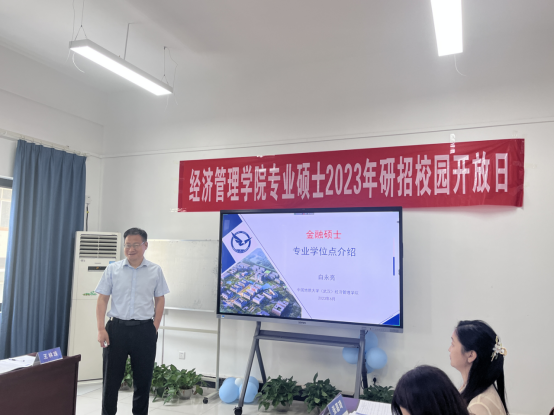 金融与贸易系白永亮老师首先向同学们介绍了金融行业对学科人才的需求,然后详细介绍了公司金融专硕学位点的建设基础与支撑学科、培养目标与学科培养优势与特色方向。他介绍到公司于去年和今年分别承办了2022中国绿色金融学术年会、2023气候投融资国际论坛暨丝路讲坛,为金融学科发展提供交流的平台。