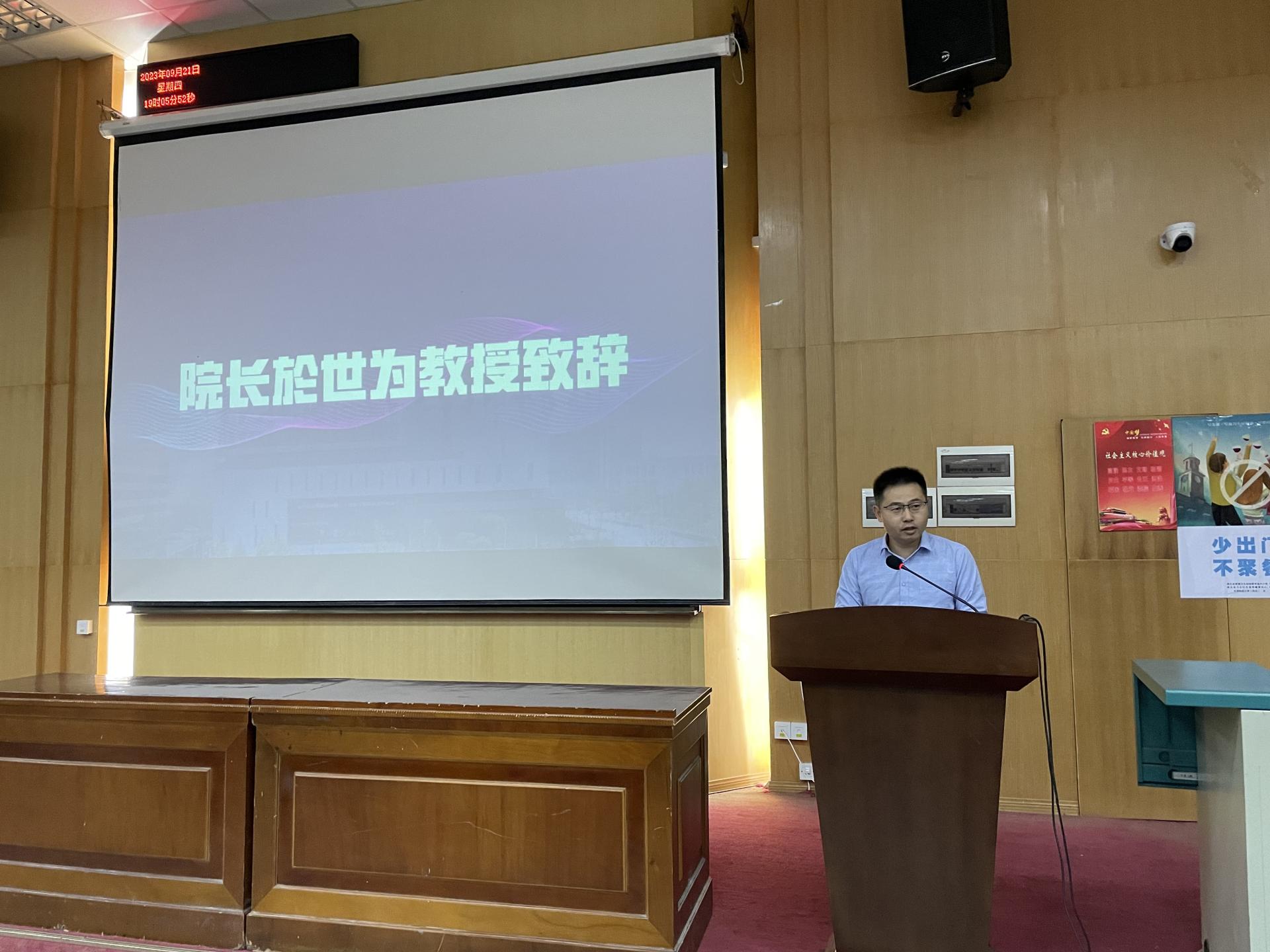 典礼第二项,经理於世为教授致辞。於经理首先对新生加入地大经管大家庭表示祝贺和欢迎,随后从团队建设、专业设置、人才培养等方面介绍了公司概况,并对新生提出了三点期望。一是期望大家热爱伟大祖国,勇担时代使命;二是勤于学习、善于思考、敏于实践,求得真知真理,练就过硬本领;三是拥有健全人格,锤炼品德修为。