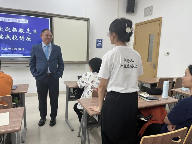 (通讯员 李会琴)为深入贯彻教育部关于新文科建设的会议精神,推动校企合作,提升员工产业认知,促进《现代酒店管理》课堂教学改革,2023年9月26日下午,旅游管理系在未来城校区公教楼119教室举行了“优秀企业家进课堂”活动。本次活动邀请的嘉宾是万豪国际酒店集团华中地区总经理杨骏先生,杨经理拥有30余年的国际酒店管理经验,历任酒店财务总监、人力资源总监、市场营销总监、副总经理及总经理等职务,现致力于国际酒店集团与院校的校企合作及人才培养。