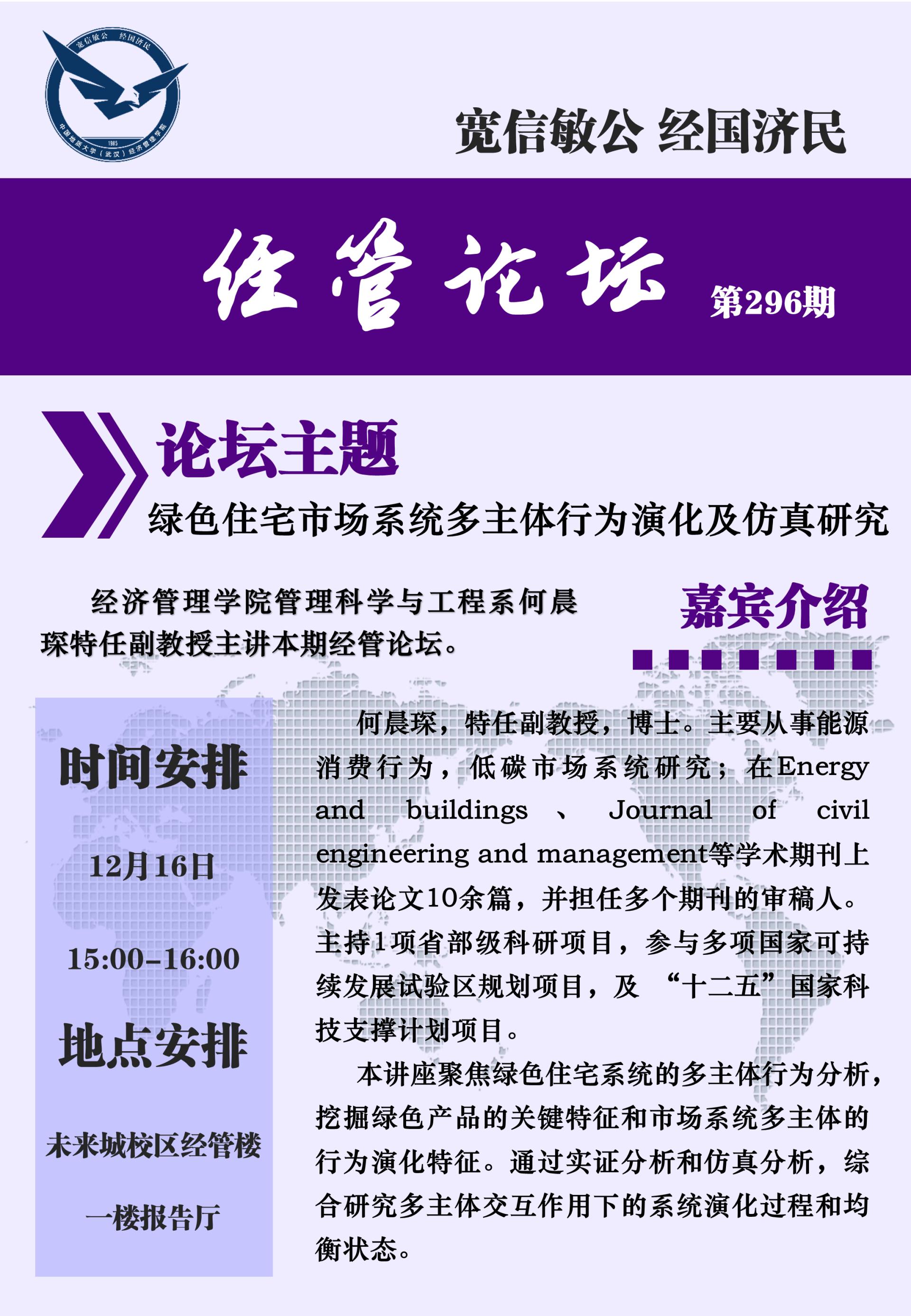经管论坛(第296期)绿色住宅市场系统多主体行为演化及仿真研究