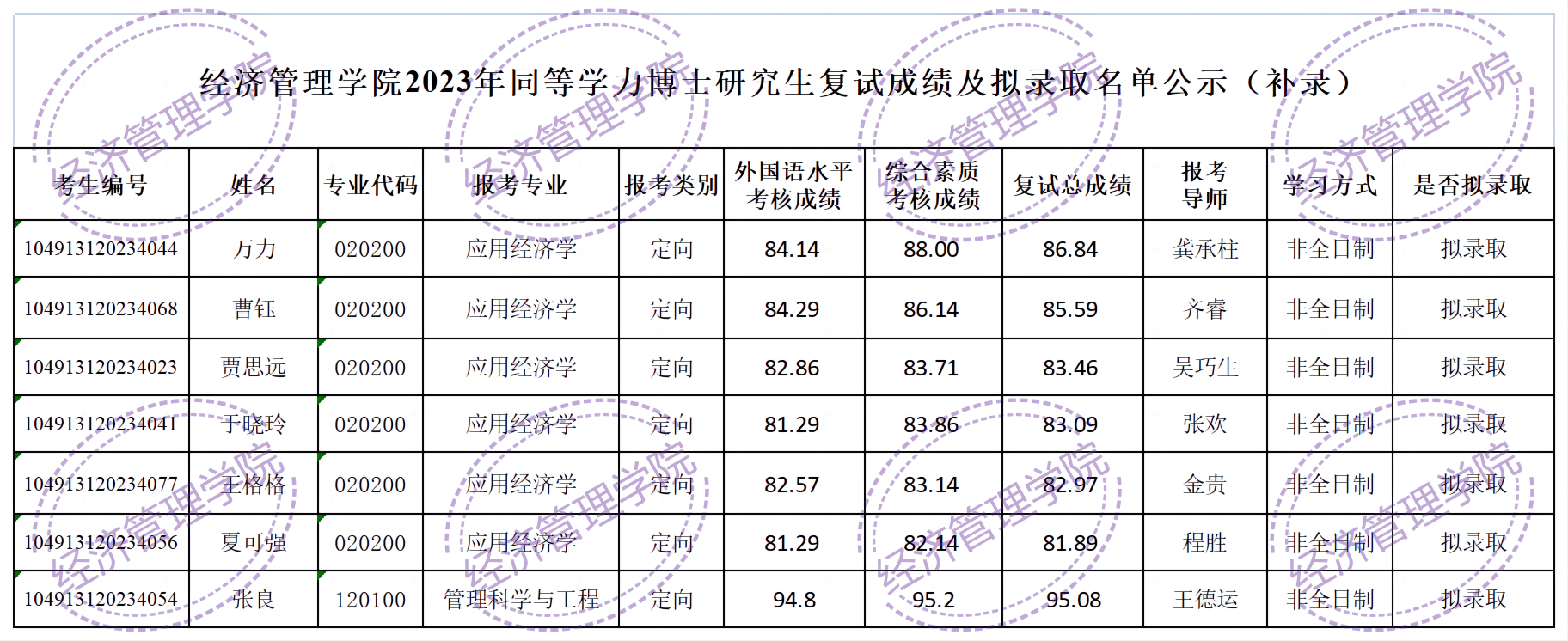 经批准,现对公司2023年拟录取单证博士生补录名单予以公示,公示期为6月16日-6月25日。在公示期内有异议的,请联系经管公司研究生办公室王老师,联系方式:027-67883204,邮箱:360655881@qq.com。