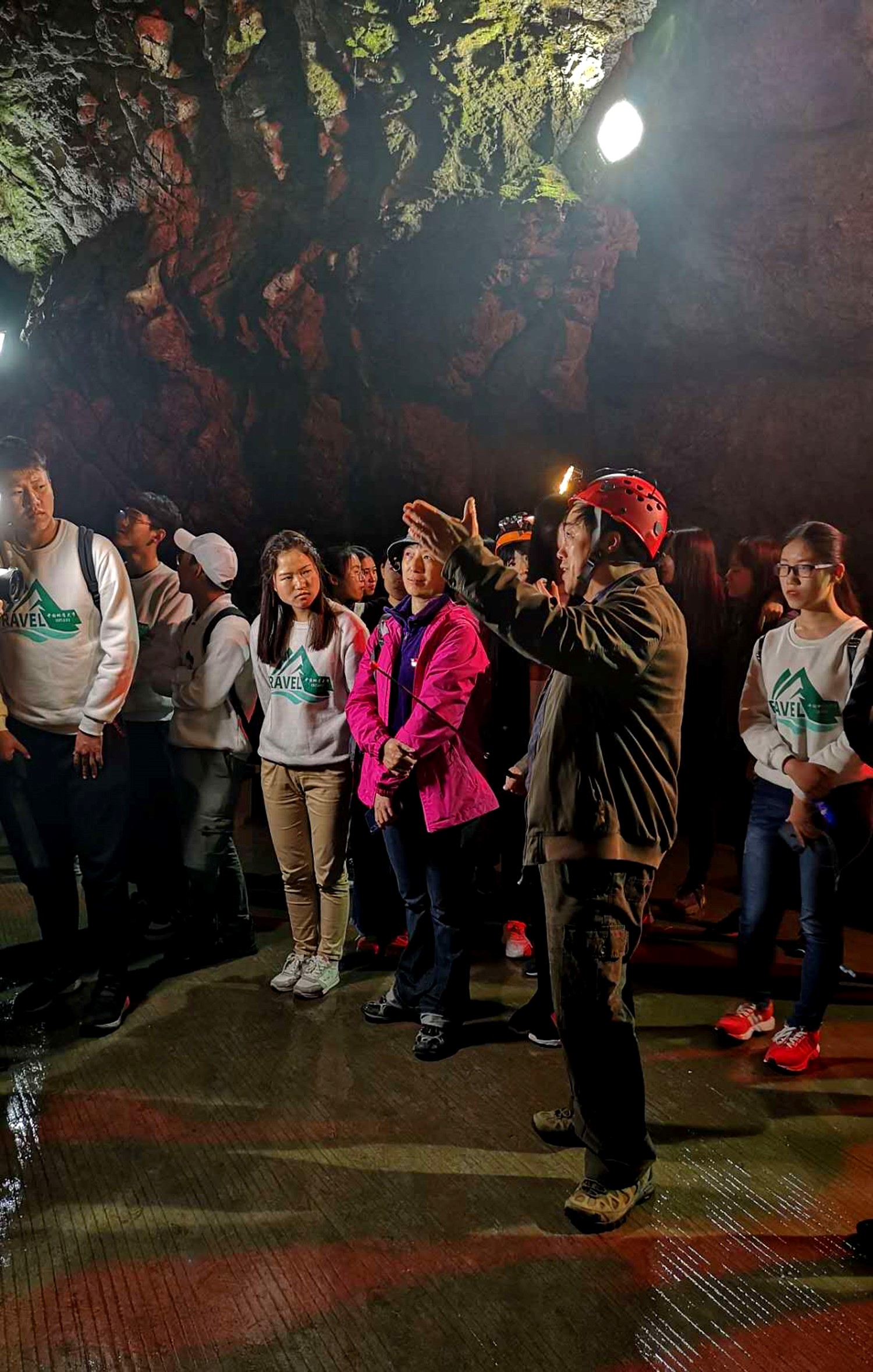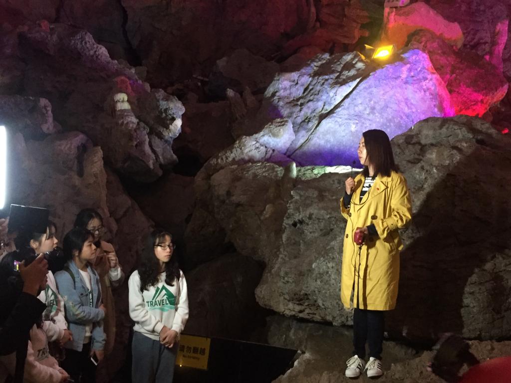 进入洞中,鄢教授详细地向同学们讲述了隐水洞岩溶地貌的形态、类别及成因,并为同学们讲解了隐水洞集地下河泛舟、乘坐小火车和步行为一体的,独一无二的内部游览交通方式。