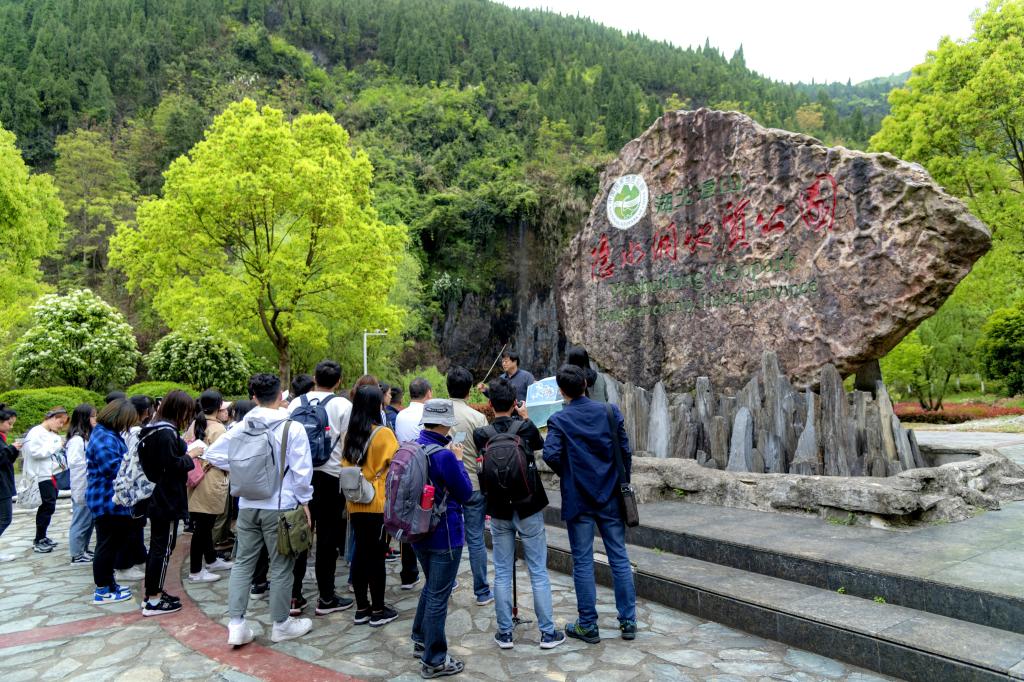 座谈会后,鄢志武教授带领旅游管理系支部和“结对领航”班级全体同学至隐水洞国家地质公园开展现场教学。在隐水洞国家地质公园主题碑前,鄢教授向同学们讲述了隐水洞的地形地貌概况和典型地质特征。