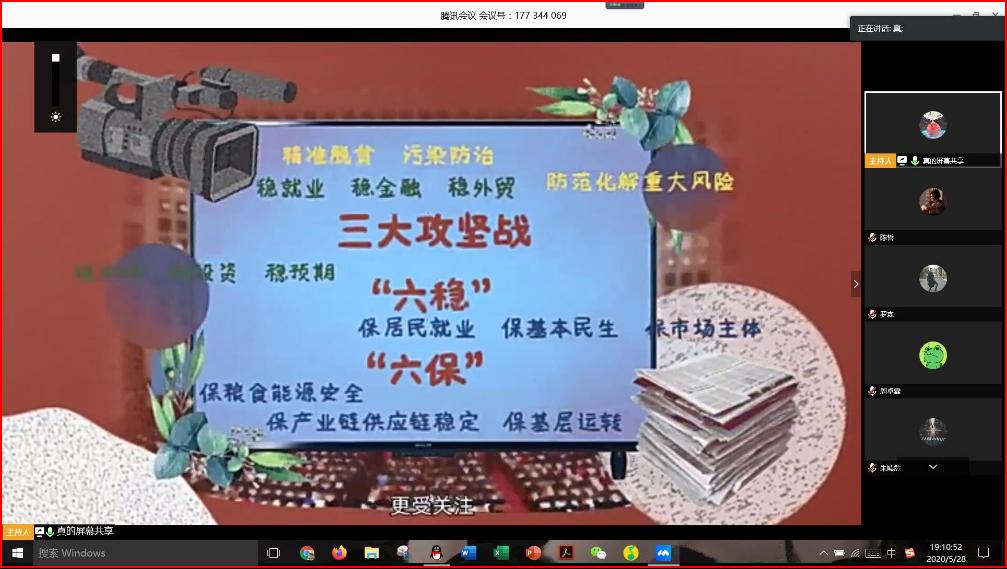 “六保”和“六稳”是党和国家面对前所未有的风险挑战,作出的科学研判和战略部署,体现出我国直面困难推动经济社会发展的决心和信心。信息管理与信息系统专业本科生党支部董文虎同志谈到,“作为2017级员工,从学习两会精神中我感到,党和国家把保就业、稳民生作为重中之重,为毕业生提供不断线的就业服务和保障,这使我对即将到来的2020年秋招更加充满信心。” 2018级管理班硕士研究生党支部夏文丽同志则表示,“今年四月份高校之间的结对帮扶,国家、湖北省以及公司对于员工招聘就业的大力支持和一系列网上招聘活动,无不体现着国家在保就业上作出的努力。相信在党和政府政策的积极引导下,在全国人民的共同努力下,我们必将战胜这次疫情。”