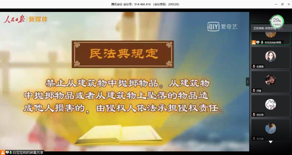 “民法典并非高高在上、不可触摸,而是与普通人息息相关,深入社会运行的毛细血管”,民法典草案的审议,作为两会的一大重点,也成为此次主题党日党员们讨论的热点。财务管理与会计学专业联合本科生党支部李雪淳同志讲到:“民法典很多都是从人民本身出发,保护我们的权利和义务,体现了党全心全意为人民服务宗旨。”经济学专业本科生党支部书记陈宝华谈到:“《民法典》,‘民’字当头,字里行间,条条款款,都彰显了以人民为中心的立法初心和使命”