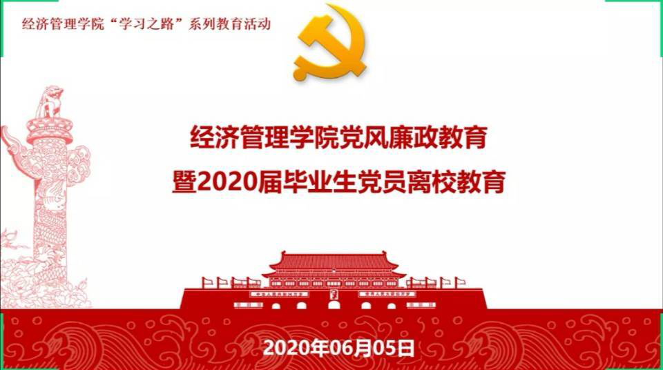 为深入贯彻落实党的十九大精神,落实立德树人根本任务,激励全体毕业党员牢记使命、胸怀祖国、脚踏实地、担当作为,经济管理公司党委于6月6日以线上会议的形式成功举办“2020年党风廉政教育暨毕业生党员离校教育”活动,全体本研200余名毕业生党员参与学习。