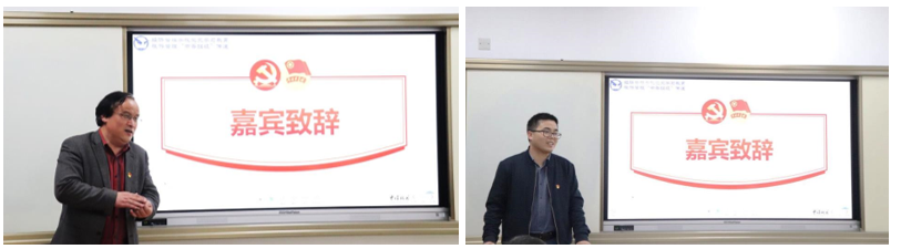 校图书馆馆长徐世球教授(左)、公司党委副书记李少杰老师(右)为活动致辞
