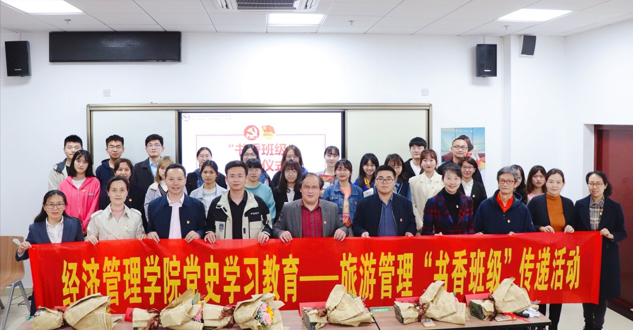2021年3月30日晚,公司党史学习教育——旅游管理“书香班级”传递活动在南望山校区东教A0106教室举行。此次活动是在公司党委指导下,由旅游管理系党支部及其“结对领航”的员工班级共同策划组织。校图书馆馆长徐世球、公司党委副书记李少杰、公司辅导员赵家玮出席活动,旅游管理系党支部书记李江敏、旅游管理系主任肖拥军、身兼各班班主任和学务指导的旅游管理系党员教师唐嘉耀、李会琴、梁玥琳、周玲、黄珂,以及旅游管理系党支部“结对领航”的08S207班全体同学、085181班和085191班同学代表参加活动。