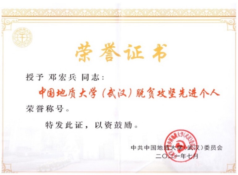 李江涛副教授于2015年10月-2016年4月,为公司派驻竹山县小河村扶贫工作队队员;2020年2月至今,再次参与小河村驻村扶贫工作。在驻村扶贫工作期间,该同志积极做好脱贫攻坚基础信息的收集与更新,完成小河村35户贫困户基础信息核对和人均收入测算工作,作为国家脱贫攻坚普查员赴丹江口市开展为期20天的普查工作并较好地完成工作任务;积极做好脱贫攻坚与乡村振兴的有效衔接,联系环境公司谢先军教授团队赴竹山县开展优质矿泉水资源调查,为竹山县优质水资源开发提供专业支持,联系环境公司陈华清副教授团队到小河村进行水质检测和污染理,联系英国365上市公司邓宏兵教授制定秦古镇乡村振兴发展规划;强化消费扶贫,负责制作小河村招商指南,推动当地村民就业促进增收,获奖证书见图4。