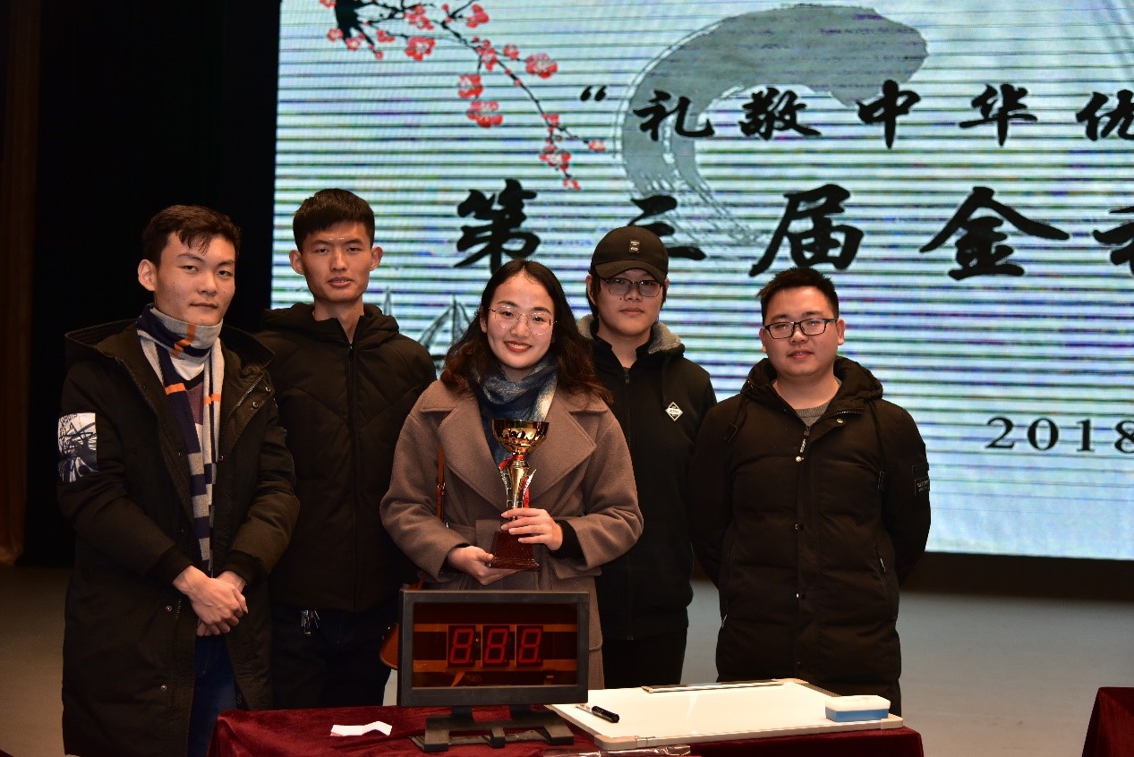 12月11日,公司第三届“礼敬中华优秀传统文化”金秋诗词大会决赛在弘毅堂举行,公司17级资产评估专业研究生鲍雷、阴朝旭、陈习良,17级经济学专业本科生夏益骏组成的“浪淘沙”团队代表公司荣获第一名。