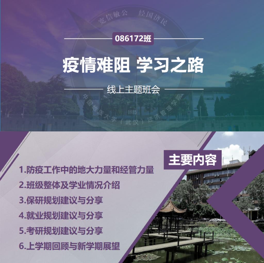 班会再次给同学们增添了信心,“我们看到地大全体师生正与全国人民一道并肩战‘疫’,我们也应该扮演好‘六个角色’,在我们的共同努力下,战胜疫情指日可待!”