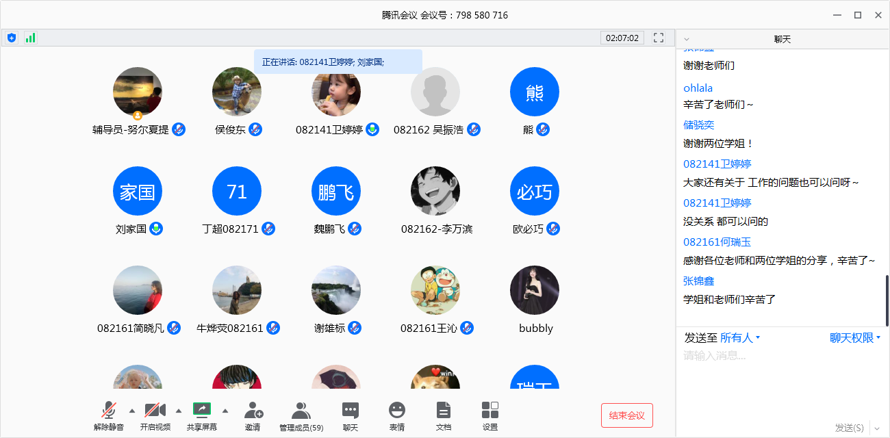 参加活动的同学们对各位老师的谆谆教导纷纷表达感激之情。至此,主持人宣布活动,腾讯会议室的人数却基本没有变化,毕业生们对地大、对经管的依依不舍,对工商系老师们的恋恋不舍场面,一时让人十分感动。
