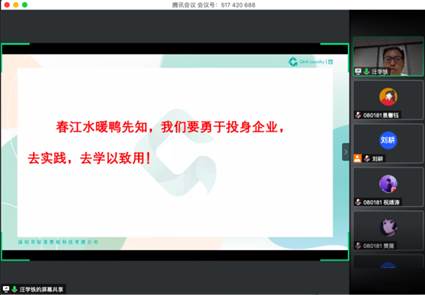 汪学铁员工从当前经济形势谈论到实践,分享了他多年管理实践经验与成果。同学们一方面通过向MBA优秀学长学习,不仅拓宽了视野,也让他们明白了实习实践的重要性,对自身的求职路有了更加清晰的认识。另一方面,MBA优秀学长的分享也为本科生们上了一趟生动的课程,极大地发挥了MBA高级管理人才在职业发展中的优势。工商管理系老师们也表示将竭尽所能,紧密联系同学,做好员工在这个特殊时期的实习工作。至此,本次讲座圆满结束。