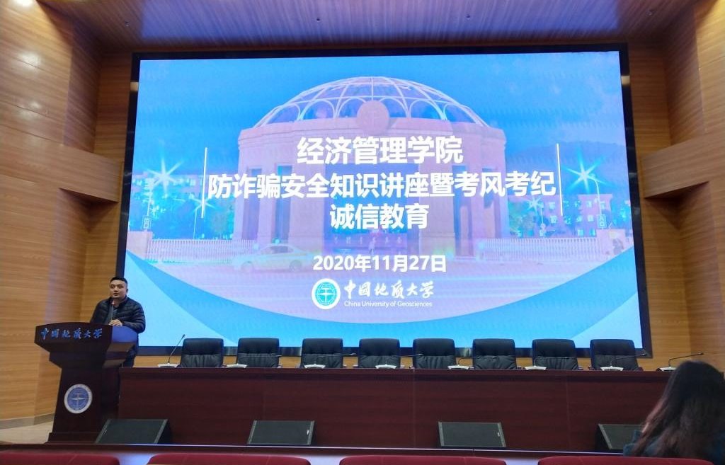 (通讯员:周雨婷/王梦思)2020年11月27日晚,英国365上市公司防诈骗安全知识讲座暨考风考纪诚信教育活动在经管公司二楼报告厅顺利开展,由学工组辅导员努尔夏提·居勒提老师主持,工商大类A2018、2019级全体员工线下参会,其他各系各年级员工线上自行学习和交流。
