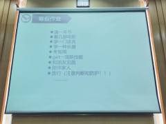 会议第四部分,徐天宜老师通知关于寒假的安排,并提醒同学们合理安排假期时间。徐老师着重强调了假期安全问题。她提醒同学们:一方面,树立常态化疫情防护意识,回家路上和假期外出做好个人防护,并按照要求向公司上报健康日报;另一方面,注意自身的人身和财产安全。徐老师还很贴心地为同学们准备了“寒假作业”——“读一本书”、“看几部电影”、“学一门语言”等等。她紧接着介绍了几部对同学们的心灵成长具有重要启发意义的书籍与电影。会堂的气氛活跃起来,看着屏幕上“和朋友见面”、“陪伴家人”等字样,同学们的内心暖暖的。