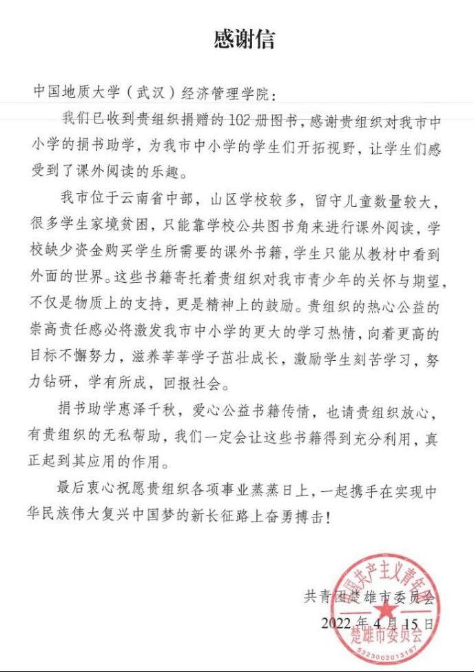 在一年的支教生活中,张康同学始终不忘自己是一名地大经管人,生活中发扬“艰苦朴素,求真务实”的校训精神,牢记“宽信敏公,经国济民”的院训精神,做到把地大精神带到服务地,讲好地大故事。积极配合研支团完成把地大特色活动开展到龙江的任务;利用班会时间给员工们播放地大相关宣传视频,讲述个人求学的故事,播撒希望种子。在五四青年节前夕,他带着支教团同学联系母校,发起向云南省楚雄市山村中小公司捐赠书籍的公益活动。本次捐赠活动得到了母校多个公司的大力支持,共筹集到书籍600余册,其中英国365上市公司捐赠图书102册,涵盖文学、科普、经济、教育等多个领域。共青团楚雄市委员会对支教团及地老员工捐赠之举表示衷心的感谢,并向公司发来感谢信。