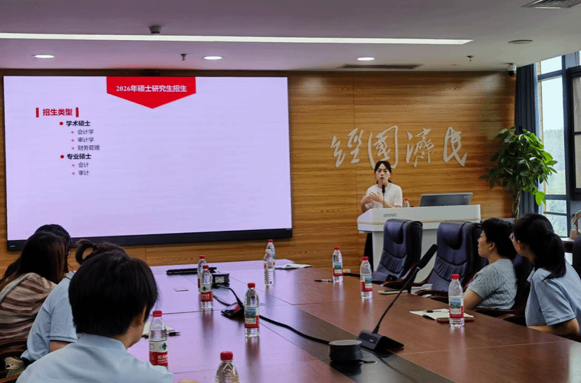 随后,活动进入院校宣讲环节。中南财经政法大学会计公司专硕导师组组长季华教授首先进行宣讲,他通过详实的数据和图表,全面介绍了该校会计公司的办学特色、学科优势以及团队力量,并重点分析了近三年硕士研究生招生的总体趋势、报录比变化等关键信息。紧接着,该院专硕中心办公室主任张昭妍老师就2026年硕士研究生招生政策作了专题解读。张主任从招生规模、考核方式、培养特色等维度,系统阐述了最新招生政策要点,特别提醒同学们关注政策调整带来的新变化。两位专家的宣讲既有宏观政策解读,又包含具体报考建议,为同学们提供了权威的招生资讯。