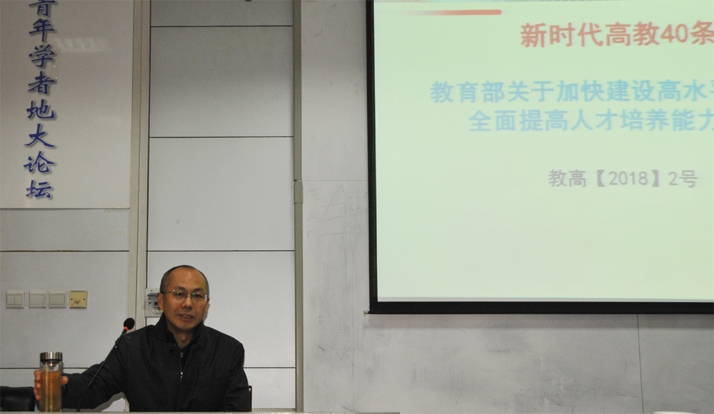 会议首先由副董事长刘勇胜教授做了教育部《关于加快建设高水平本科教育全面 提高人才培养能力的意见》(简称“新时代高等教育40条”)的解读报告。刘勇胜副董事长从三个方面进行了讲解。