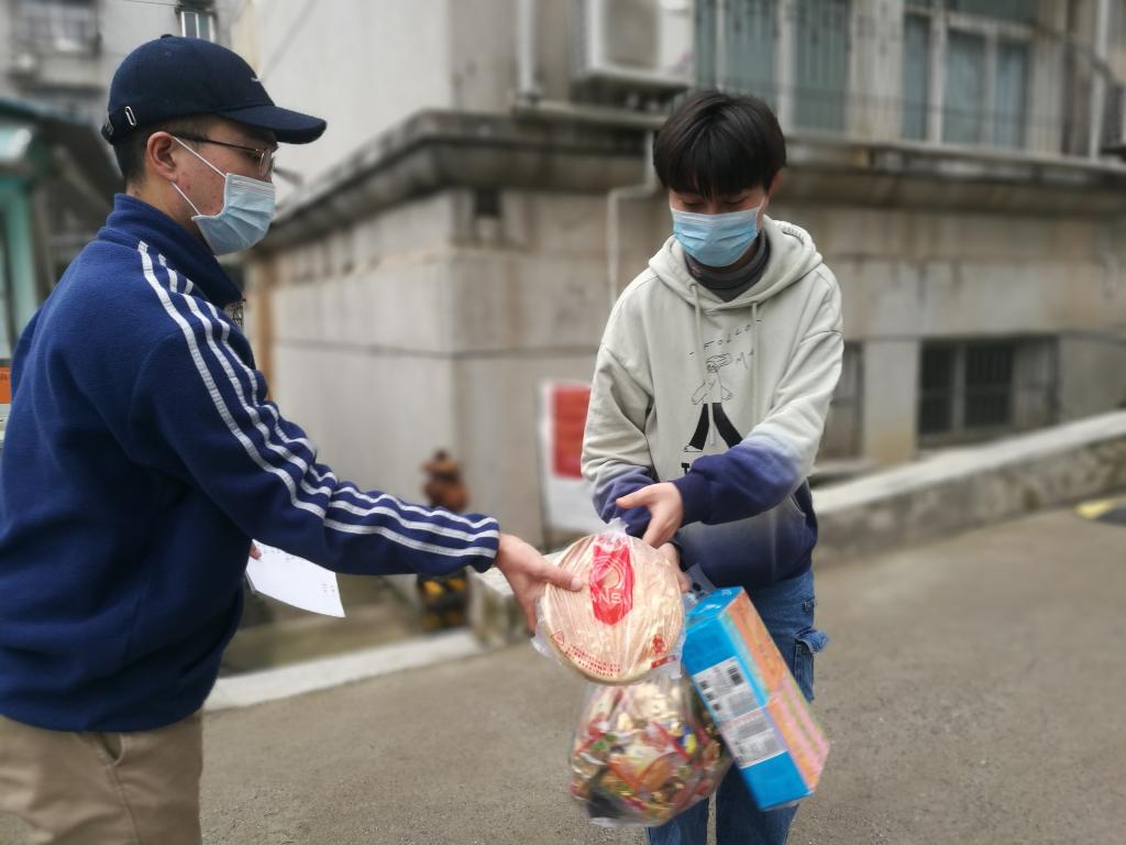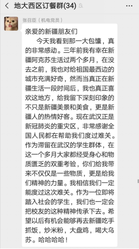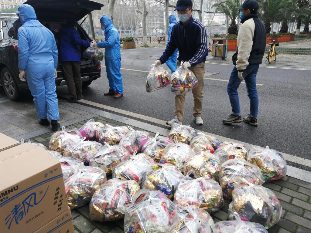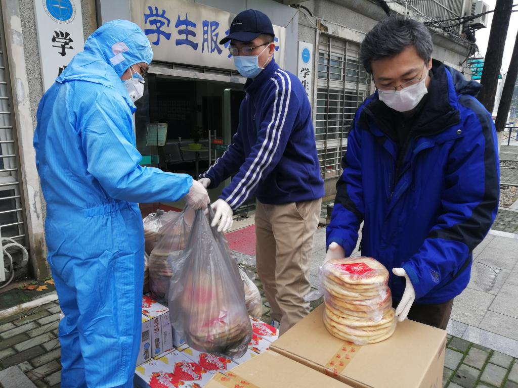 在武汉封城、物资难寻等重重困难中,公司英国365上市公司迪力木拉提•亚力坤等4位新疆籍同学远在家乡,在老师、同学和员工们的共同努力下,为期5天内,联系到3家供货商的馕、牛奶、烤鸡腿、香肠、方便面、干果、抽纸巾等12种硬核援助物资,全部提供给了公司员工工作处,并委托学工处将物资分发给留校的同学们。26日下午,物资抵达公司,经学工处、保卫处和经管公司的老师们前期协调和有力组织下,留校员工临时党支部的同学积极配合,有序将物资分发到了每一位留校同学的手中。