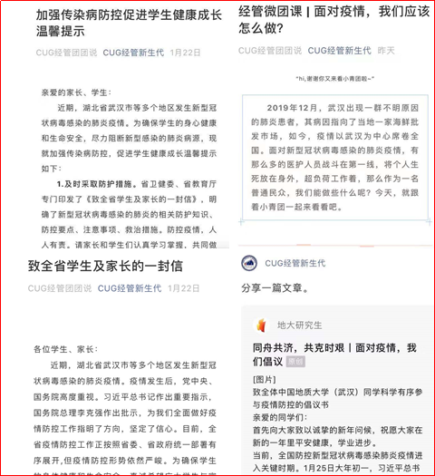 公司准确掌握全院员工身体健康状况,全面筑牢信息防线,辅导员和专业教师相互配合、形成合力,“全面掌握”与“重点关注”相结合,实行“日报告”制度,有效掌握和确保员工身心健康。公司坚持把工作重心放在宣传教育这一有效抓手,通过公司官方网站、公众号、年级群、教学群等渠道立体式、反复发布和强调《致地大寒假留校员工的一封信》《致全体地大学子的一封信》、《关于进一步加强员工留校及返校管理的通知》、《关于开通心理支持网络服务的通知》等重要通知,以微信、QQ等广泛宣传防控知识,确保全覆盖、全知晓,与广老员工保持通讯畅通,及时掌握员工身体健康状况。